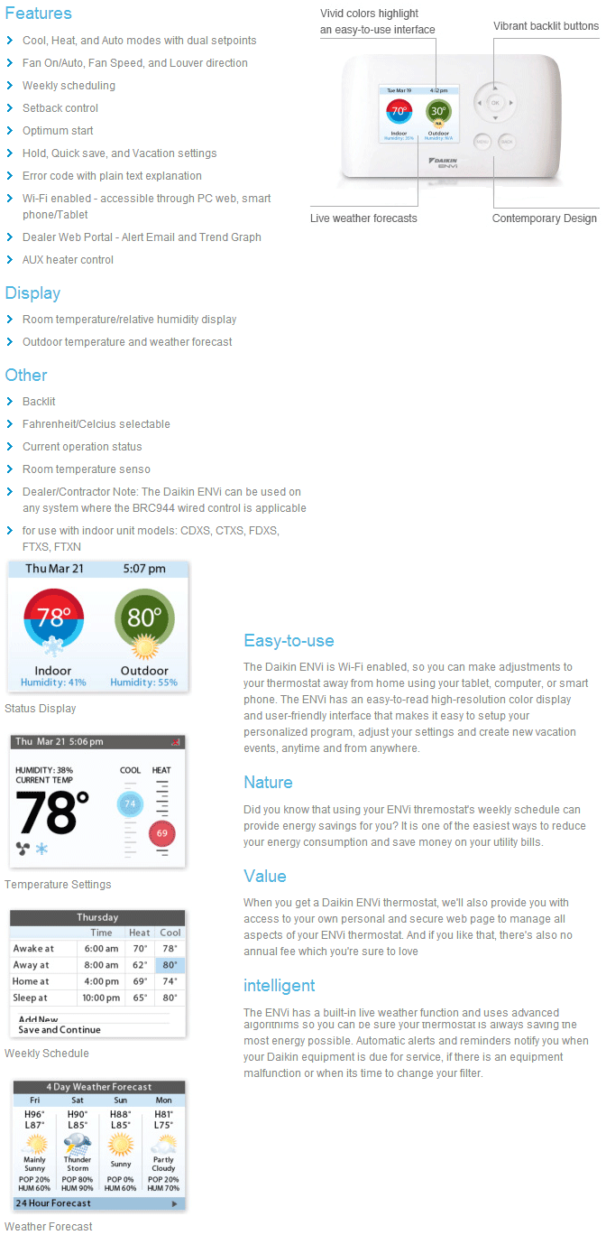 Brand: Daikin Save Listing| Email Listing | Share Product Name: Daikin ENVi Intelligent Thermostat Item#: daikin-envi Availability: Discontinued, Please Email For Future Stock Availability. Choose QTY: 1 2 3 4 5 6 7 8 9 10 11 12 13 14 15 16 17 18 19 20 Required